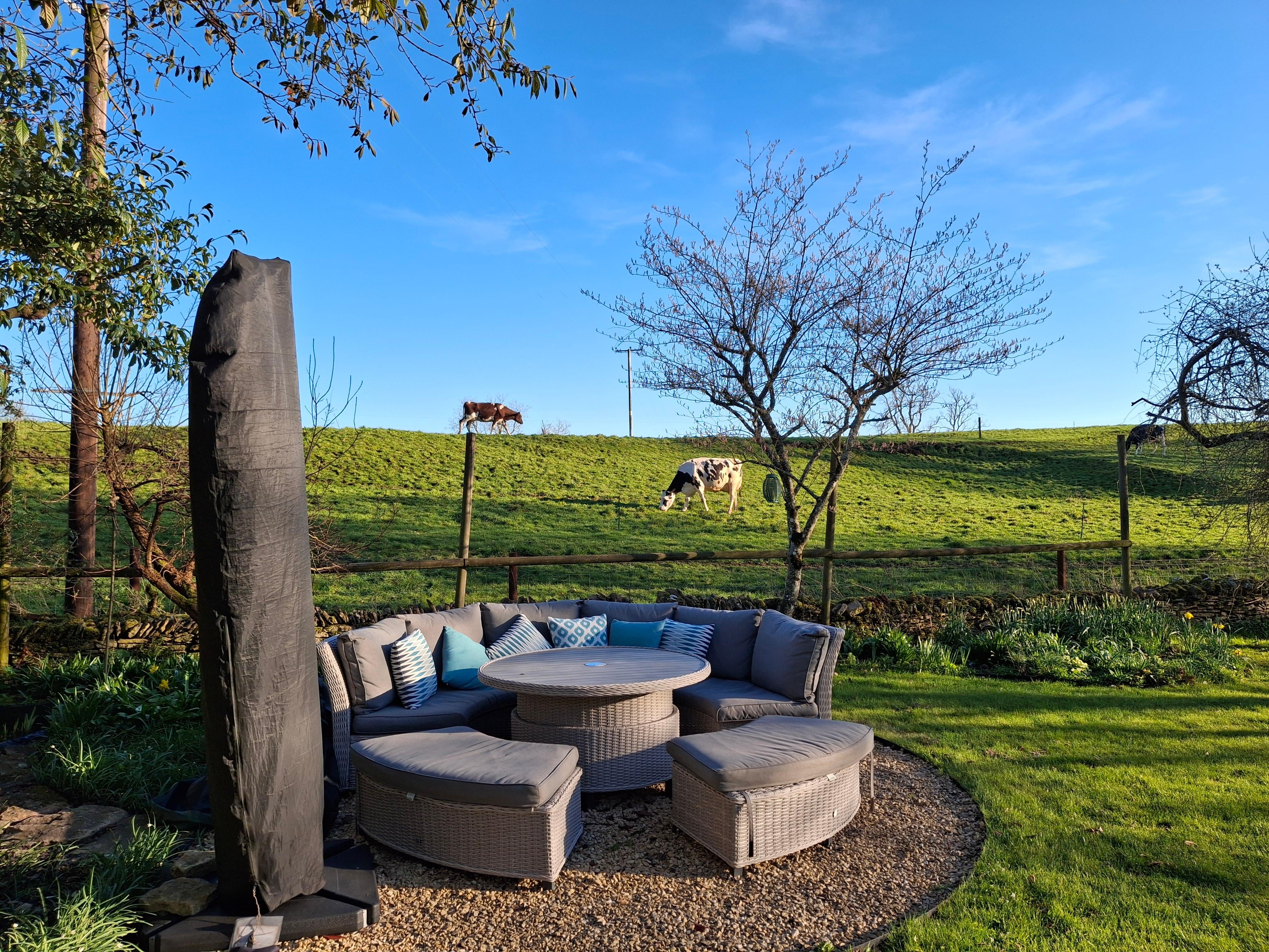 Entrance to Bluebell Cottage is via a driveway with private parking for two cars, with a very large garden behind. The garden looks onto fields on two sides (look out for the dairy cows!), has a large grassed area and a number of pretty floral garden beds. Garden amenities include hot tub, Weber gas BBQ and spacious outdoor dining/seating area with sun canopy. There is also a small ‘nature pond’ and a ‘summer house’ with kids games and activities inside.