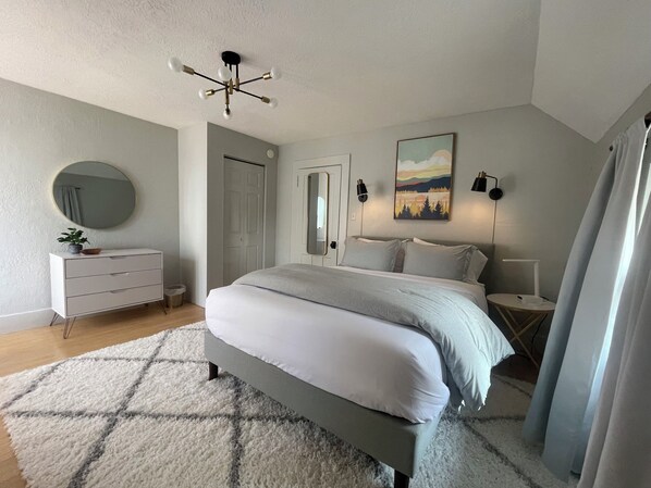 Upstairs we took extra care to ensure each bedroom can provide what our guests need. This includes offering 600 thread-count, real cotton sheets, an AC unit, a fan, a fireplace, and all-new furniture, curtains, upscale bed frames, extra comfortable mattresses, plump pillows, door mirrors for event wardrobe changes, and crisp, modern decor.