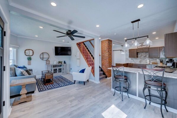 Stylish updated home with many amenities to accommodate your stay while in Cleveland. The home features 3 bedrooms, one queen bed, one full bed, a twin bed and an office space. The kitchen is fully equipped for making a home made meal on the gas range and oven. Breakfast bar separates kitchen and dining area which opens up to the living room. There is a very large modern and clean bathroom on the second floor. Enjoy the peaceful environment of this home in a suburban setting.