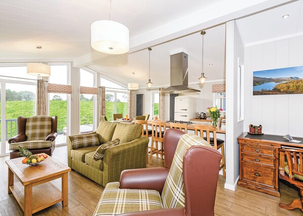 Indulge in the epitome of luxury with our lodge, a perfect haven for a relaxing break in the Lakes. The country-chic open-plan living area welcomes you with a large Flatscreen TV, inviting sofas, and a warming wood burner, creating a cosy ambiance. The elegant kitchen, featuring a breakfast bar, seamlessly blends with the stylish dining area for delightful gatherings. The en suite master double bedroom features a monsoon shower. Additionally, a spacious twin room and a family bathroom complete the accommodations. Open the enchanting French doors and step onto the decking area with outdoor furniture, an ideal space for al fresco dining. Interior fixtures and fittings may vary. Please note: If you plan to bring a cherished pet, use the pet filter during the booking process to notify the resort in advance. Immerse yourself in Lakeside luxury, create cherished memories, and let this lodge be the perfect canvas for your rejuvenating escape. Pets allowed in selected accommodations only.