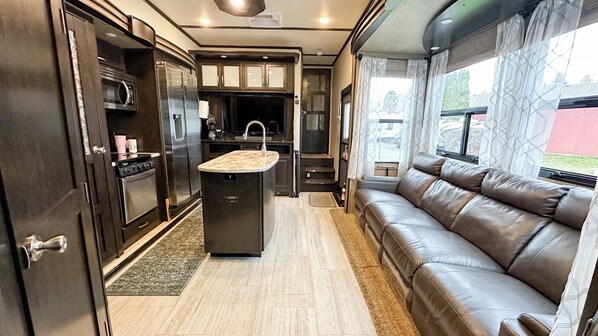 Welcome to our RV, your perfect home while you explore Coeur d’Alene. Inside, guests find two cozy bedrooms featuring a queen bed and a twin bed, plus a living room with loft bed and a pack and play. The space stays comfortable year-round with heating and AC. A clean bathroom with a shower adds convenience to your stay. There are also more showers and toilets available at the bathhouse just a short walk away. Whether you’re relaxing inside or exploring nearby, this wonderful RV offers a comfortable and inviting retreat. It’s easy to see why you’ll be able to unwind at our place.