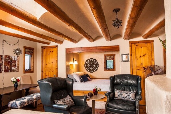 Our beautiful and cozy Casa Hovel, located a hop away from the Ivywild eateries, a skip from the Broadmoor and a jump from downtown, is the ultimate place to stay for your next trip to Colorado Springs. This home is unlike any other you have experienced. Built in order to sustain efficient living, Casa Hovel has a unique, southwestern feel. The adobe exterior, colorful tiles, kiva fireplace and ceiling vigas will leave you feeling comforted and relaxed for your entire stay. While the home does include two bedrooms and one and a half baths, each bedroom is located in a separate building, accommodating the privacy of our guests.