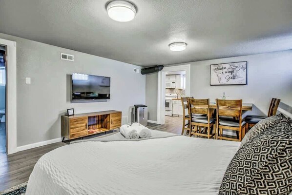 Each bedroom is designed for comfort, featuring high-quality bedding and plush pillows. One bedroom includes a desk and chair, ideal for remote work with fiber WiFi (500+ Mbps). A pack 'n play and highchair are available for guests traveling with little ones.
