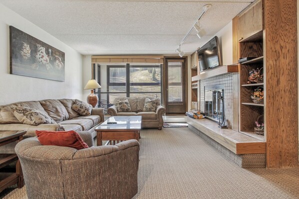 Center Village at Copper Mountain Ski Resort is home to this inviting condo. Enjoy a peaceful retreat with slope views from your glass-enclosed balcony, cozy up by the wood-burning fireplace, or unwind in the outdoor hot tub after a day on the slopes.