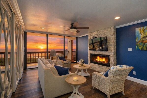 As you enter the unit, the gourmet kitchen is state-of-the-art with a plumbed Keurig coffee maker, farm sink, larger refrigerator, and under-counter microwave. The extended kitchen island bar seats 6 comfortably. On the opposite wall is a large ice maker and wine refrigerator. The living room is made for relaxation with two chairs and a couch. Relax next to the built-in electric fireplace encased in beautiful stacked gray rock. A large TV hangs above the fireplace. Beautiful, white, Hunter-Douglas motorized shades have been installed in the living room and bedroom to provide lift filtering and privacy. When fully opened, slide open the doors to the 27 foot patio that includes plenty of seating for everyone to enjoy the breathtaking views. This is the perfect place to sip coffee, wine, or your other favorite beverages as you watch the waves roll in!