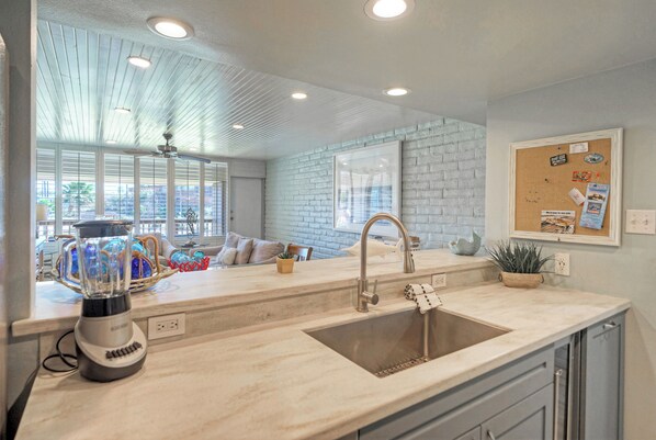 Escape to Tropical Haven, your slice of Port Aransas paradise! This remodeled getaway is the epitome of beachside bliss, offering a perfect blend of comfort, style, and convenience for you and your group. The interior of this condo boasts modern finishes and high-end furnishings complemented by beachy decor. Kick back and relax in the living area after a long day of fun in the sun – the open floor plan is perfect for spending quality time with your friends and family. Whip up delicious meals in the fully equipped kitchen. It gleams with bright cabinetry, a vibrant blue tile backsplash, and stainless steel appliances. Grab a barstool seat at the kitchen counter for a quick snack, or gather around the dining area for shared meals and laughter. Two comfortable bedrooms and a queen sleeper sofa provide plenty of space for your group, while 2 full bathrooms add convenience. Step outside to the private patio for leisurely afternoons with the ocean breeze.
