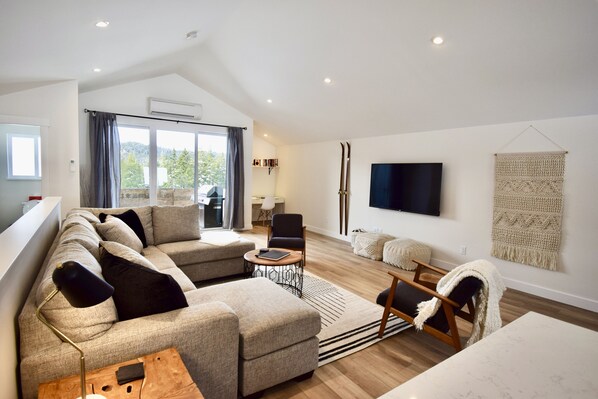 Relax on the large U-shaped sectional after a long day on the slopes, with a Netflix movie on the 65" Tv.