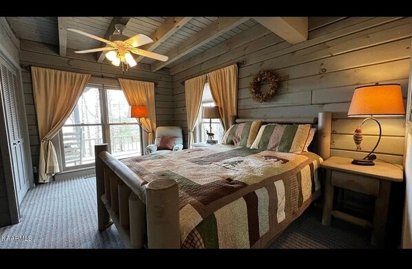 Our 2 bedroom, 2 bath cabin with loft sleeps 6. Plus there is a pack-n-play for a toddler or infant. It has a well furnished kitchen with a gas stove, dishwasher, microwave, a kitchen bar for dining (no formal dinning room), and a cozy and comfortable den with a seasonal gas log fireplace (avail. Sept. 15th - May 15th), and 50' flat screen TV. There's also a flat screen TV for each of the bedrooms and loft. Bedroom windows provide beautiful mountain views. The master bedroom has a queen bed on the main floor and a second bedroom with a king bed upstairs. Each bedroom has an adjoining full bath. The open loft area overlooking the den can sleep 2 additional guests on a daybed with trundle. A jogger stroller and infant seat with tray are also available on premises.