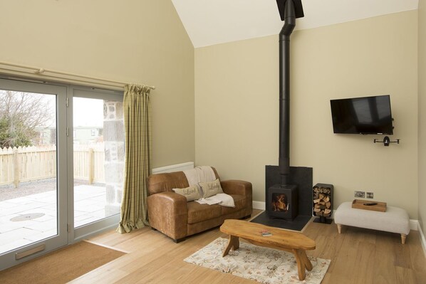 Doves Cottage is a cosy luxuriously appointed bothy style cottage with one large ensuite super king bedroom, based in the heart of Blairmore Farm. The cottage was converted from the old cattle byre in 2017 and was designed for couples looking for a private break to be able to as much or as little as they would like. The ample open plan kitchen and sitting room is south-facing with fabulous views over the Strathearn Valley, the large glass patio doors lead straight out on the enclosed patio and catches the sun all day long. The sitting room with wood burning stove (logs included in the rental) along with the comfortable seating lends itself perfectly to relaxing with a good book or stream a film or favourite box set. The contemporary kitchen is well appointed for either cooking up a storm using our own farm produce or simply hearing up a meal from our Farm Kitchen Menu (4 ring induction hob, oven, microwave, fridge-freezer with water dispense and dishwasher). Doves Cottage is ideally located for both relaxing rural getaways or as a base to explore Perthshire and the Highlands of Scotland. For further information about the cottage or our accessibility statement please do not hesitate to get in touch.