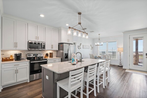 Once inside the living area offers a full sized leather couch and loveseat along with two leather swivel rocking recliners to relax on after your long day of exploring the island. A 60" flat screen streaming TV allows you to log into your favorite account to stream television shows or movies. Inside the cabinet under the television you'll find multiple games to enjoy in case you just want to stay in and enjoy the house. The kitchen offers marble countertops, all the appliances and cookware needed to make any meal you can dream up. The house offers a keurig coffee maker and a drip coffee maker can be found in the pantry. Seating for 4 on the island is complemented with additional seating for 8 at the dining room table just off the kitchen. The walk in pantry offers additional kitchen appliances for use (blenders, mixers etc) along with a full sized washer and dryer.
