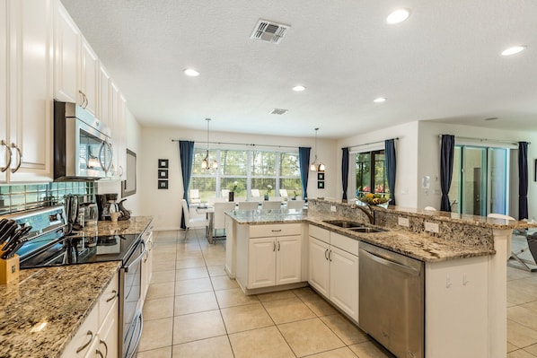 The beautiful kitchen with hi spec stainless steel appliances and solid granite counter-tops is a chef's dream. Catch a casual snack at the breakfast bar, or serve a full meal for 12 at the huge dining table - either way there is space for everyone! Even a butler's kitchen, to mix the cocktails!!
