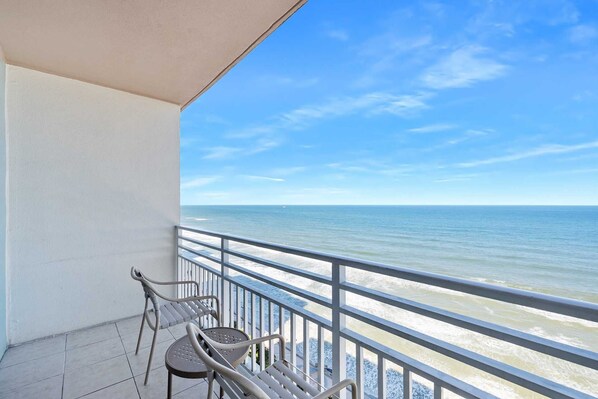 Beautiful condo includes new flooring, a full kitchen, two new flat screen TV's, washer/dryer, free high-speed Wi-Fi, and more! Fully furnished with two full sized beds in a large private bedroom with a bonus queen sofa sleeper in the living room. The private oceanfront balcony provides spectacular views of the beach, pools, band shell and pier.