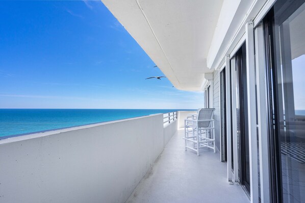 When you enter this unit the direct, oceanfront views will take your breath away! The oceanfront balcony can be accessed from the living room as well as the master bedroom. This is a stunning corner unit so the balcony begins facing the ocean and continues to wrap around the side of the building allowing you take in the views of the city-scape and Halifax River. The living room includes an abundance of comfortable furniture and a Smart TV. The kitchen comes fully stocked for all your cooking needs and overlooks the dining area with seating for 8 as well as two additional bar stools. This is also one of the few units in The Horizons that includes a private, in-unit laundry room.