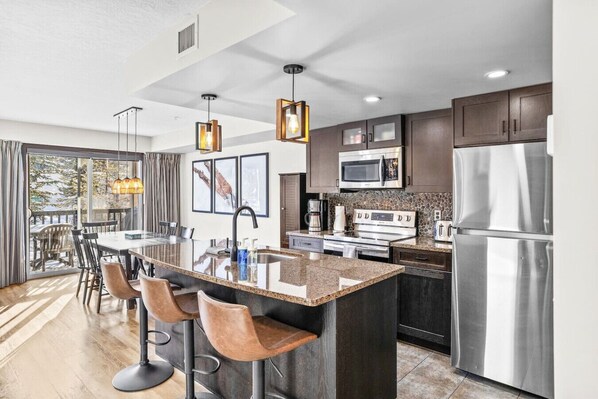 Fridge, microwave, oven, stovetop - Bears Den 2BR Getaway with Hot Tub, BBQ and Near DT (Dead Man`s Flats)
