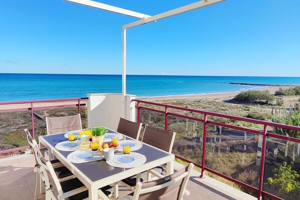 The apartment consists of three large rooms, one of them with a double bed and the other two with two single beds. In addition, it has two bathrooms, both with shower trays. The kitchen is independent and fully equipped. The terrace is spacious and has an awning that will allow you to enjoy the sunrise and sunset or enjoy a delicious breakfast with views of the Mediterranean Sea. Without a doubt, you will live a unique experience!