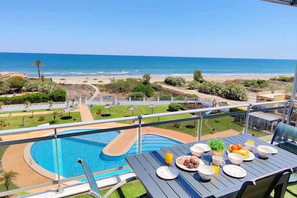 This apartment has three spacious bedrooms, one with a double bed and the other two with two single beds. It also has two bathrooms. The kitchen is independent and fully equipped. The terrace is spacious and has an awning, which allows you to enjoy the sunrise and sunset or enjoy a delicious breakfast overlooking the Mediterranean Sea. Without a doubt, an unbeatable experience!