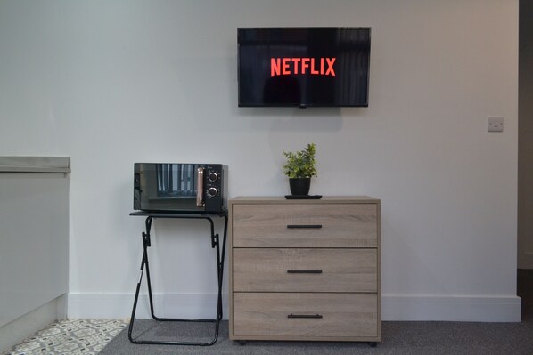 Relax in this peaceful and centrally-located home, perfectly styled for re-locators, business and leisure. The self-contained studio features a private kitchenette, an en-suite bathroom, a comfortable small double bed and sofa bed. Enjoy entertainment with the swivel TV that can be watched from both the sofa or bed.