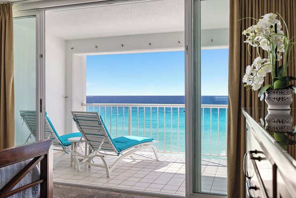 Come revel in the magnificent ocean views of this spectacular 2 bedroom, 2 bath condo, perfectly located on the 7th floor. This warmly decorated space offers 1430 sq. foot tiled throughout, with carpet in both bedrooms.  Relax and enjoy your destination vacation with a 30 foot private balcony, spanning from the living room to the master bedroom, high speed wireless internet, and free beach service March 1st through the Sunday after Thanksgiving (Monthly reservations do not receive complimentary beach service set-ups.) This space offers a beautiful master bedroom with a luxurious king-sized bed, accompanied by a custom walk-in shower in the attached bathroom. The gorgeous guest bedroom is equipped with 2 queen beds, and a tub/shower combo in the guest bathroom. Your ultimate family vacation awaits!