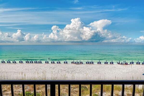 This beautifully updated one-bedroom condo offers the perfect setting for a romantic escape or a small family vacation— comfortably sleeping up to six guests. Located on the second floor with panoramic Gulf views, Coral Reef Club 20 features a breezy open layout, stylish coastal décor, and a private beachfront balcony just steps from the sugar-white sand.