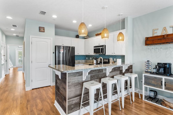 Deja Blue is a coastal chic home perfectly situated in the heart of Destin, with a large community pool right outside and less than 3 blocks to the beach. Enjoy an open concept floor plan, fully stocked kitchen with coffee/tea bar and NEW Smart TVs throughout; unwind on the large 2nd story patio overlooking the pool or head out for a quick walk to some of best shops and restaurants nearby.