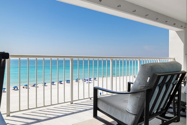Come relax and enjoy the world-famous sugar white beaches of the Emerald Coast in this tastefully decorated condo. This 1430sq foot, 2 bedroom, 2 bath condo features a 30’ private beach-front balcony, high speed wireless internet and free beach service March 1st through the Sunday after Thanksgiving. (Monthly reservations do not receive complimentary beach set-ups.) This spacious condo has a king size bed in the master bedroom with custom walk in shower in the attached bathroom. The guest bedroom is equipped with 2 queen beds. A sofa sleeper in the living room provides additional sleeping accommodations. The kitchen has been updated with new cabinets and counter tops. A full-size washer and dryer can be found in the laundry room. This condo has tile throughout common areas, with carpet in the bedrooms. A separate ice maker can be found in the wet bar. There is a reserved, covered, parking space in the garage.