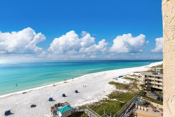 The room itself features an open floor plan with tile flooring throughout the living room, dining room and kitchen. The master suite features a large king sized bed, while the living room boasts a cozy sofa which converts into a queen sleeper. Enjoy spectacular views from your private balcony or go relax with your toes in the sand while enjoying these wonderful accommodations SunDestin 905 has to offer!