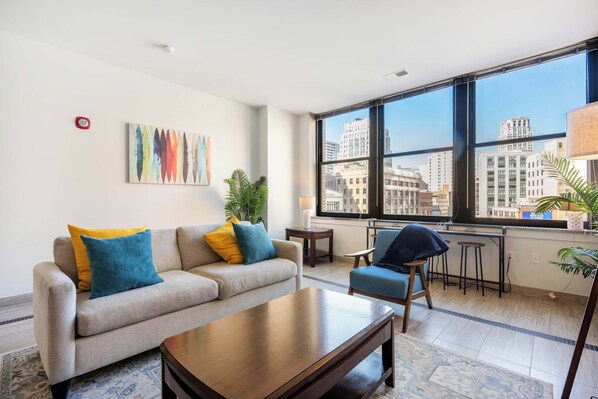 Step into a world of charm and history at our Detroit haven, a former savings bank. Luxuriate in a captivating space, boasting city views through grand windows. Immerse yourself in premium comfort with stainless steel appliances and elegantly curated furnishings. Experience the perfect blend of character and modern convenience in the heart of the city.
