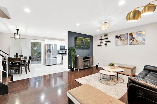 Main Living Room: Stylishly furnished with a large smart TV and an open layout, perfect for relaxation and entertainment.