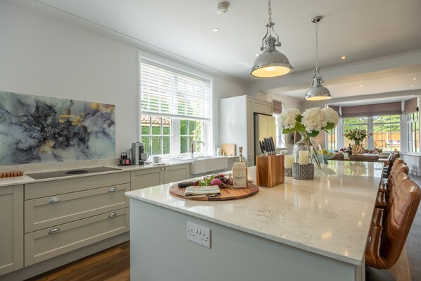 With an island and breakfast bar including four stools, Neff double oven with warming drawer, induction hob, large fridge freezer, dishwasher, Nespresso Virtuo coffee machine, slow cooker, food mixer and microwave, toasted sandwich maker, wine fridge and dining table with seating for 10 guests.