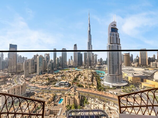 • Balcony with a coffee table and two chairs showcasing a full Burj Khalifa and fountain show view
