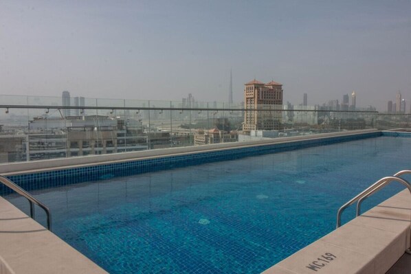 The swimming has a beautiful view of Dubai Skyline and the Old Dubai. On one hand, enjoy Burj Khalifa and Dubai Frame view from the rooftop and the hustle and bustle of Karama and Bur Dubai on the other.