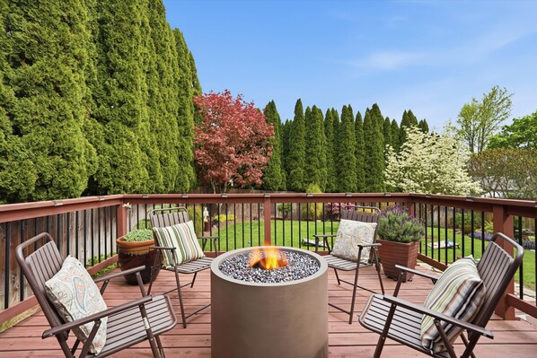 Step outside to a private fenced backyard surrounded by beautiful landscaping and fruiting blueberry and raspberry bushes. Dine al fresco on the spacious deck with luxury patio furniture, a BBQ grill, and now a propane fire pit—perfect for evening s’mores or stargazing under the Oregon sky.