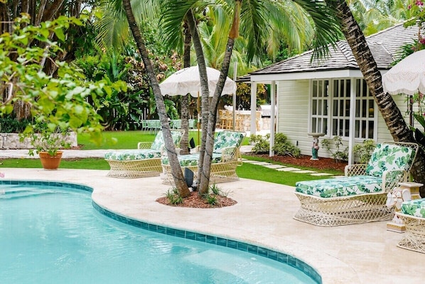 Pool area - Pool loungers, umbrellas, pool floats, lounge seating, dining table, outdoor bar, sonos system.