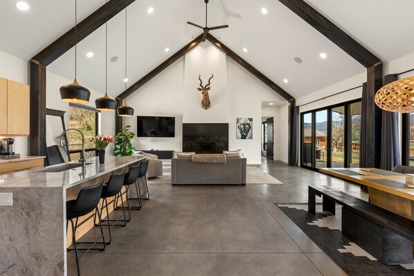 Surrounded by mountain views, this unique property includes a modern two-bedroom main house and a stylish one-bedroom apartment located above the detached garage. Each space has its own entrance, driveway, kitchen, laundry, and living area, giving your group the flexibility to gather when you want and spread out when you need space.