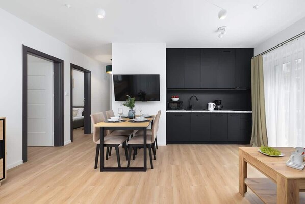 This stylish and spacious apartment, accommodating up to 6 guests, is an excellent choice for families, groups of friends, and business travelers alike. The comfortable interior features two bedrooms, a functional living room, and a fully equipped kitchenette, ensuring comfort throughout your stay.