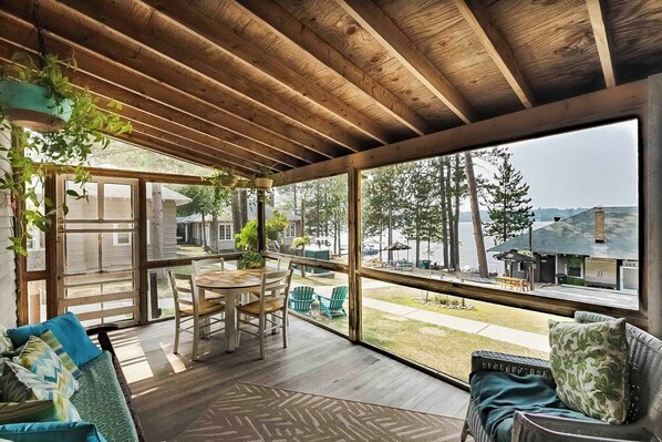 The cabin fit 7 people and two dogs very comfortably. Love that you can bring your fur babies with no extra charge or security deposit. We stayed in the cottage with a wonderful screen porch and an amazing view of the lake. The Marina bar was right in front of the cottage, which is perfect for a bit of fun. Also, really like that it closes at 11pm. Respectable time for all. We’re definitely going back!! Met the owner, Great Guy!! Thank you Jim!!