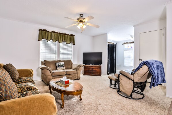This budget-friendly home invites you to kick back and relax in the pleasant living area, furnished with comfortable sofas and a large TV where you can watch your favorite shows and movies while munching on the snack of your choice. Surprise your beloved family and friends with tasty treats and homemade meals thanks to the well-appointed kitchen. It's complete with everything you need - a full-size fridge, stove, oven, coffee maker, and even a dishwasher!