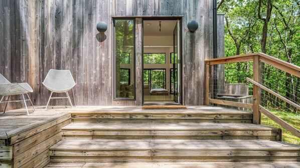 Guests who are looking to escape the hustle of everyday life, and yet remain within close proximity to local amenities will adore this thoughtfully planned, eco-conscious estate in East Hampton. Surrounded by trees and on a wide, quiet street, this four-bedroom, three-bathroom home includes 2,200 square feet of living space. Entering the home, you will be impressed by the abundance of natural light that flows through the home via ample windows, sliding doors, and skylights. The modern and minimalist furnishings help to highlight the beauty of the surrounding landscape. In the living room, a large sectional invites guests to relax in front of the wood fireplace. The expansive sliding doors and provide remarkable views of the deck, pool, and grounds. Making your way into the kitchen and dining space, you will encounter a large wooden table with bench seating that is set directly adjacent to the u-shaped kitchen. The kitchen is clean and uncluttered with creamy flat-panel cabinets, gray countertops, and an appliance suite that blends seamlessly with the space. The kitchen island will make an ideal prep surface or additional informal dining space. The Aquasana drinking water filter eliminates the need for wasteful plastic water bottles and instead glass bottles are available for your use. Each bedroom has its own unique and whimsical personality with various colors, textures, and patterns. On the main floor, two bedrooms with queen beds each have their own balcony and share a bathroom. On the second floor, a bunk space with two twin beds also an ensuite bathroom and its own a balcony. In the master suite, youll enjoy a king bed, a walk-in closet, and a luxurious ensuite bathroom with double sinks, glass shower, and soaking tub. This estate is ideal for active guests with endless options for activities. Enjoy a live spin class on the Peloton, tour the neighborhood on the skateboards and bikes, take a swim in the heated saltwater pool, or make your way to nearby Gerard Beach with the available surfboards and stand-up paddle boards. For guests looking to relax, spend time on the oversized deck that overlooks the grounds where you can dine alfresco at the table with seating for eight, rest in one of the many chaise loungers surrounding the pool and grounds, or use the earth lite massage table that is available for in-home treatments.