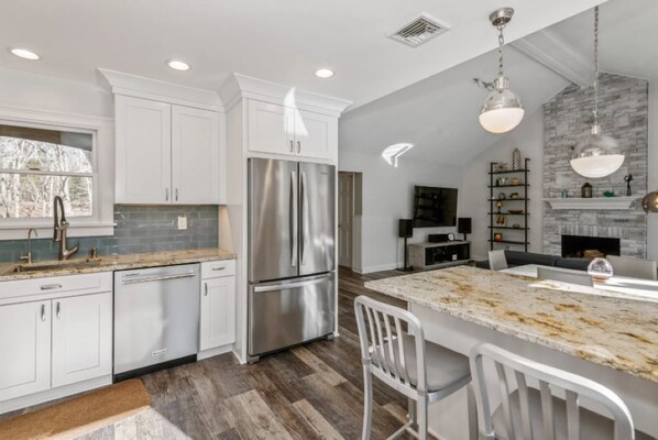 This newly renovated, private immaculately clean home located in quiet Settlers Landing across from nature preserve, within the Northwest community. Conveniently located to Sammy’s Beach, Three Mile Harbor, Cedar Point Park and to town. The open layout is bright with three bedrooms, and two baths: one with Jacuzzi tub and shower. Open living with cathedral ceilings and fireplace is bright with all new appliances, CAC, and furniture. The outside area is secluded and perfect for entertaining with attached garage, 20’x40’ pool with extensive bi-level decking with gas grill, multiple patio dining and lounging areas with full-sun, outdoor shower, and fire pit. All new electronics; smart TVs in all rooms, entertainment system, with internet. No pets or large groups.