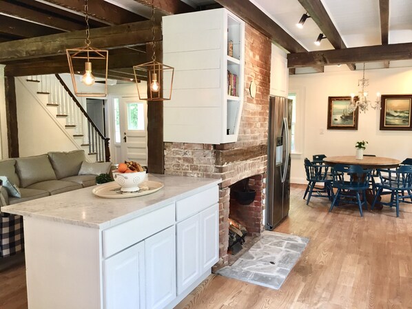 Conveniently located behind lush, fragrant hedges, Cedargate is deep in East End quaint history as well as in its allure. Located steps from the Moriches Bay this historical 1830's seaside farmhouse underwent a complete and total restoration in 2019. Tastefully modernized, Our Farmhouse features cold crisp central air conditioning, original exposed beams, hand hewn girders and lots of exposed brick and stonework. Its serene, enchanting setting will warm your soul. Offering five bedrooms in total, it enjoys a downstairs master en suite with a master spa featuring a steam shower, deep Jaccuzi tub, heated towel rack and separate toilet room with bidet. The library/media room features one of three, attractive, gas burning fireplaces, along with a sun drenched living room with a handsome gas burning stove. The gourmet kitchen features high end stainless appliances, honed Carrara marble throughout and an original brick fireplace. The second level enjoys three additional bedrooms and even a South facing veranda overlooking the property. Old World meets new world with an in house sound system and smart home automation. Artsy attributes are appreciated throughout. This original Tuthill home is beautifully sited on very private generous acreage. Rear and front yards are replete with glorious berry and vegetable gardens as well as abundant old growth specimen trees. Retreat- like, the ultra private property offers ample treasures from an outdoor screened gazebo, Game Barn Hideout, oversized heated salt water heated pool , brilliant outdoor shower off the master, shade corners for afternoon tea, 'hammock hang outs' and so much more! This is a unique and very private home on Tuthill Point.