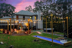 Title: Pocono Dream House! Heated Pool, Fire Pit, Bowling, Mini Golf! Reviews, Deals & Photos 2026 - Expedia.co.uk [See all properties](http://www.expedia.co.uk/Hotel-Search?regionId=&selected=109414594&adults=2&children=&sort=RECOMMENDED&useRewards=false&semdtl=&userIntent=&vip=false) Entire home # Pocono Dream House! Heated Pool, Fire Pit, Bowling, Mini Golf! Family-friendly holiday home with outdoor pool and Hot tub ## Photo gallery for Pocono Dream House! Heated Pool, Fire Pit, Bowling, Mini Golf! ![Property grounds - Pocono Dream House! Heated Pool, Fire Pit, Bowling, Mini Golf! (East Stroudsburg)](https://images.trvl-media.com/lodging/110000000/109420000/109414600/109414594/44339206.jpg?impolicy=resizecrop&rw=598&ra=fit) ![Children’s area - Pocono Dream House! Heated Pool, Fire Pit, Bowling, Mini Golf! (East Stroudsburg)](https://images.trvl-media.com/lodging/110000000/109420000/109414600/109414594/15ad6602.jpg?impolicy=resizecrop&rw=297&ra=fit) ![Outdoor spa tub - Pocono Dream House! Heated Pool, Fire Pit, Bowling, Mini Golf! (East Stroudsburg)](https://images.trvl-media.com/lodging/110000000/109420000/109414600/109414594/e47e6fae.jpg?impolicy=resizecrop&rw=297&ra=fit) ![Fridge, microwave, oven, stovetop - Pocono Dream House! Heated Pool, Fire Pit, Bowling, Mini Golf! (East Stroudsburg)](https://images.trvl-media.com/lodging/110000000/109420000/109414600/109414594/fdc771ae.jpg?impolicy=resizecrop&rw=297&ra=fit) ![Fridge, microwave, oven, stovetop - Pocono Dream House! Heated Pool, Fire Pit, Bowling, Mini Golf! (East Stroudsburg)](https://images.trvl-media.com/lodging/110000000/109420000/109414600/109414594/669b56f8.jpg?impolicy=resizecrop&rw=297&ra=fit) - Overview - Location - Amenities - Policies Minutes from the Poconos natural attractions, this retreat offers a heated pool, hot tub and fire pit for warm weather fun. Inside, enjoy an open living room with smart TV and comfy seating or indulge in games like pool table, foosball and arcade games. ## Reviews 9.8 Exceptional ### Entire home 5 bedrooms3 bathrooms ## Popular amenities - Pool - Hot tub - Kitchen - Washing machine - Dryer - Pet-friendly ## Add dates for prices Check-in Check-out Travellers ## About this property ### Entire place You'll have the entire home to yourself and will only share it with other guests in your party. ### Pocono Dream House! Heated Pool, Fire Pit, Bowling, Mini Golf! Conveniently located just minutes away from all the natural attractions that the Poconos has to offer (lakes, hiking, & more!), you will have all the amenities & entertainment you could need right here at home. Heated pool, hot tub, fire pit, pool table, arcade games, and much more! 15 min - Delaware Water Gap, Downtown Stroudsburg 20 min - Kalahari Resort, Shawnee Mountain, Big Pocono State Park 30 min - Bushkill Falls Experience The Poconos With Us & Learn More Below! HEATED POOL IS ONLY OPEN BETWEEN MEMORIAL DAY WEEKEND & LABOR DAY WEEKEND. \*\*During the summer months (Memorial Day weekend - Labor Day weekend), you will receive amenity badges that allow you to access the following amenities. If you’re staying with us outside of these dates, these amenities will be closed.\*\* ☀ Lakes (with beach access - swimming allowed!) ☀ Pools ☀ Tennis courts ☀ Basketball courts ☀ Volleyball courts ☀ Dog park ☀ Playground areas KEY FEATURES: ☀ 5 beautiful bedrooms; 2 kings, 2 queens, and 4 twin beds (two built-in bunk beds) ☀ 2.5 modern bathrooms ☀ Modern kitchen with new, stainless steel appliances ☀ Open living room with lots of comfy seating & smart TV ☀ Dining room with seating to comfortably accommodate 8 (+ 4 at the kitchen table & more outdoor dining) ☀ Incredible game rooms with pool table, foosball, air hockey, arcade games, & more! ☀ AMAZING backyard, with a heated pool (open Jun-Aug ONLY), hot tub, fire pit, & more! Here Are A Few Kind Words From Our Past Guests: “This was a great place to stay! The morning light through the windows was so beautiful. Overall, just a relaxing experience. The hosts were super responsive whenever I had a question. I would stay again!” - Emily “Sabrina was very accommodating and communicative. the house is beautiful and very comfortable, close to nature hikes.” - Jennifer “This place was lovely! Exactly as pictured! Very clean and excellent host experience!!! I plan to come back again!” - Regina ☆☆ BEDROOMS ☆☆ Each of the 5 bedrooms in this home have been beautifully designed for comfort - every bedroom in this home has a smart TV. On the bottom floor, the unbelievable bunk bedroom is something you have to see to believe! Two custom, built-in bunk beds (each twin-over-twin), a SLIDE, pop-a-shot basketball, foosball, air hockey, and arcade games. This room truly has ALL the fun! Upstairs are the remaining 4 bedrooms. The master bedroom has a king bed & private ensuite bathroom. The third bedroom also has a king bed, while the fourth and fifth bedrooms have one queen bed in each. ☆☆ BATHROOMS ☆☆ There are 2.5 modern bathrooms throughout this home. Downstairs, the half bathroom has a sink & toilet only. Upstairs, the private master ensuite has two sinks, a toilet, and a tub/shower combo. The upstairs hallway bathroom has a sink, toilet, and shower/tub combo. ☆☆ KITCHEN & DINING ☆☆ The modern kitchen is located right off of the main living areas, and is loaded with all new stainless steel appliances & a coffee station (including a Keurig & coffee pods). The dining room is right next to the kitchen, with enough seating to comfortably fit 8 people, plus 4 more seats for dining in the kitchen & more at the outdoor dining table. ☆☆ LIVING ROOM ☆☆ In the living room, you’ll be greeted with lots of comfy seating & a big smart TV. This is the perfect spot to host your movie nights & games with your friends and family! ☆☆ GAME ROOM ☆☆ The pool table room is located right off of the living room, which also has its own smart TV and s