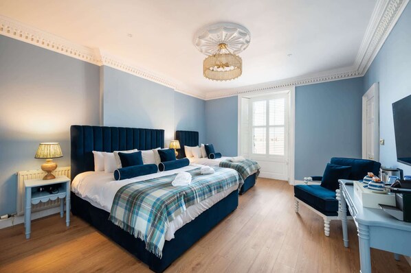 At the centre, a super-king and single bed promise a restful night’s sleep, each dressed in crisp white linens, plush velvet cushions, and tartan throws that add a welcoming touch of heritage charm. Freshly folded towels rest at the foot of the beds, ready for your arrival.