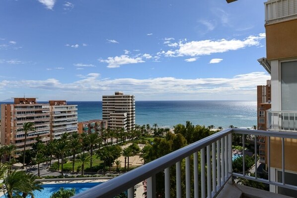 -80 m² apartment with Mediterranean Sea views -2 bedrooms, 2 bathrooms, sleeps up to 4 guests -Living room with air conditioning and open kitchen -Shared pool and outdoor shower -Private balcony -Wi-Fi and washing machine -Bed linen, towels, and beach towels included -High chairs and cots upon request free of charge -Parking on property + free street parking -5 min walk to beach and supermarket