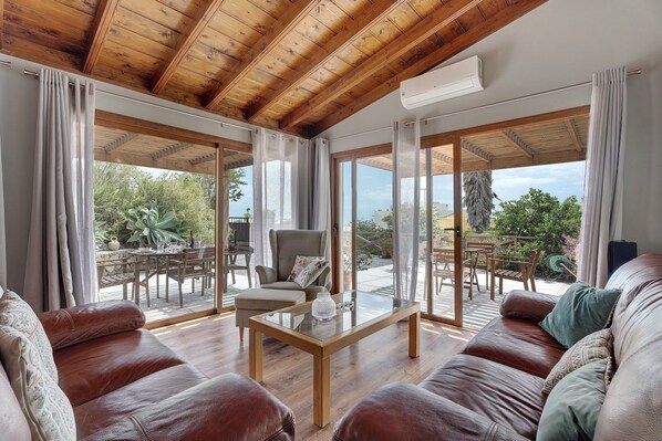 The vacation home offers a private outdoor area with a pool, a garden, an open terrace, a barbecue and an outdoor shower. The terrace is furnished for dining or enjoying drinks with a view.