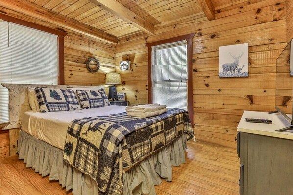 *King Master upstairs with 42" TV for streaming, private bath with custom walk in shower