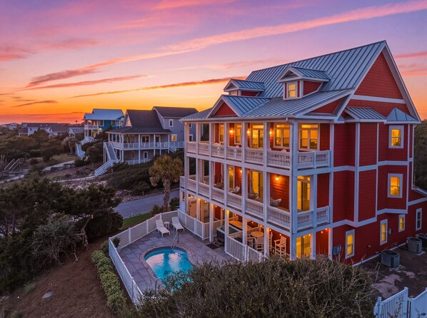 Indulgent Amenities for an Unforgettable Stay Heated Swimming Pool and Brand-New Hot Tub: Dive into relaxation in our heated pool or unwind in the private hot tub for the ultimate coastal escape. Pool heat is available for $650/week plus tax. Expanded Outdoor Oasis: Our outdoor spaces have been taken to the next level with an all-new and expanded pool deck, creating even more room to relax, gather, and enjoy the sunshine. We also added two new patios beside the putting green, designed for both fun and connection. These spaces feature a luxurious fire pit, hammock station, party lights, and a comfortable sitting area where you can unwind while watching family and friends enjoy the putting green. New Outdoor Kitchen and Shower: The outdoor experience is even better with our new and improved outdoor kitchen, complete with a built-in grill and sink, making poolside meals and evening cookouts effortless. We also upgraded the outdoor shower for a more polished and enjoyable post-beach rinse-off. Spacious Putting Green: Perfect your putt on our recently refinished green while the group gathers nearby on the new patios for the ultimate backyard hangout. Improved Deck Swings: Our second-floor deck swings have been completely refreshed, giving you an even better place to sip coffee, enjoy the ocean breeze, and take in the view. Expanded Parking: We significantly expanded the parking area to accommodate more vehicles, making Red Barn Resort even more convenient for large families and groups traveling together. Private Elevator for Easy Living: With a private elevator servicing every level, Red Barn Resort makes move-in day effortless. Bringing luggage to your room, sending groceries up to the third-floor kitchen, and navigating the home throughout your stay is simple and convenient. Our reverse floor plan places the main living area and kitchen on the top floor to capture the best possible ocean views, and the elevator makes that layout easy for everyone to enjoy. First-Floor Entertainment Haven: Enjoy endless fun with a re-felted pool table, foosball, ping pong table, stocked claw machine, and Golden Tee arcade system, all anchored by a 75-inch flat screen TV for the ultimate game room experience. Baby-Friendly Amenities: High chair, portable crib with mattress (bring your own linens), and 2 baby gates. Discover Hidden Treasures: Embark on a family-friendly scavenger hunt throughout the house, unveiling hidden gems and creating joyful memories. Instagram-Ready Moments: Capture your vacation fun at our specially designed Instagram wall, the perfect backdrop for your getaway photos. Interactive Welcome Guide: Use the QR code provided in the images or visit the Hostfully guidebook to view home details, local attractions, and more. Sophisticated Comfort and Culinary Delight Luxurious Linens and Bedding: Experience exceptional comfort with our clean-every-time linens, duvets, and towels, thoughtfully selected for a restful and relaxing stay. Each bed is equipped with a newer mattress to help you recharge after long beach days. Gourmet Kitchen: Unleash your inner chef in our fully stocked kitchen, featuring designer cookware, a Vitamix blender, KitchenAid mixer, Ninja coffee machine, double oven, refrigerator with ice maker, two dishwashers, microwave, wet bar, wine refrigerator, and toaster oven. Thoughtful Renovations and Elegant Furnishings Under new ownership, Red Barn Resort has undergone extensive renovations, including freshly painted walls and ceilings, a custom-designed couch, oversized chairs, updated dining seating for 12, and beautifully refreshed bedrooms and bathrooms.