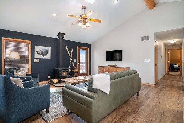 Evenings at Bear Hugs Cabin are just as magical. Gather your loved ones and get cozy around the crackling wood burning fireplace or strike up some competition for an unforgettable game night in the game room. And for those who need to stay connected or productive, we've got you covered with a dedicated workspace perfect for remote work or homeschooling—all wrapped up in tasteful cabin decor that makes every moment feel special.