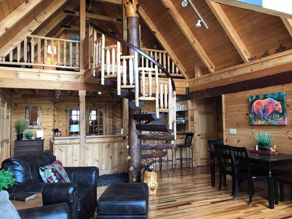 Relax in front of the gas log fireplace, put your feet up and enjoy music with our Bluetooth-enabled Bose Soundbar or the large smart TV, all connected with 1G fiber internet. Climb the spiral staircase and enjoy our library loft, furnished with two reading chairs, ottomans and an abundant supply of books to choose from. North Star Cabin also provides a small office area with a desk and wireless printer (USB connection included), just in case you need to do a little work during your stay.