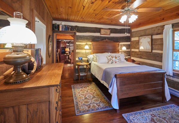 The interior features large rooms with (2) bedrooms and (2) bathrooms. The master is located on main floor (queen) and has a small private bathroom. Black walnut plank flooring, antique knotty pine paneling and soap stone block fireplace blend with newer components to set the stage for this cozy retreat. The second bedroom encompasses the entire upstairs (one double and two single beds) with vaulted ceiling and ceiling fans.