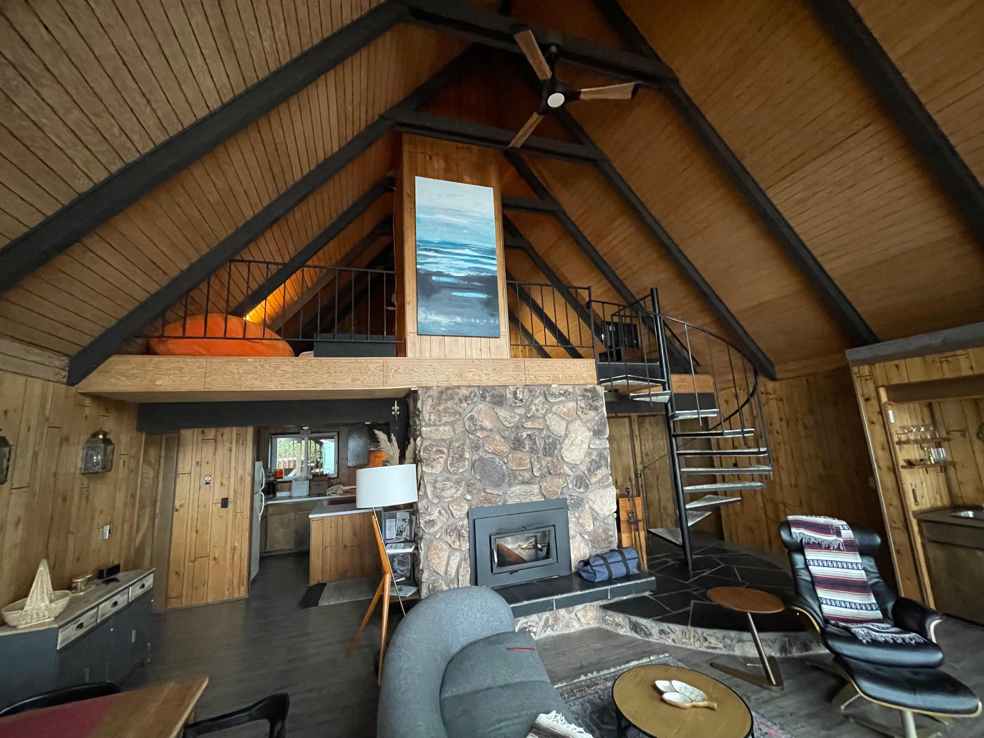 The cliffside views of the ever-changing ocean are mesmerizing from this 3 bedroom home that sleeps up to 8. The open concept living area has large windows facing the sea. The wood paneled walls, soaring wood beamed ceiling and rock fireplace will make you feel close to nature. Cozy up to the wood burning fireplace during a winter squall and enjoy watching the moods of the ocean (a starter bundle of wood is available for $10 if we are notified prior to check-in). Open to the living room is a full kitchen ready to help make some memorable meals and a large dining table to gather around. On each side of the living area is a bedroom with an ensuite bath and king bed. Each bedroom has a sliding glass door with access to the ocean front deck. A spiral staircase leads to a lofted bedroom with a king bed (that can be split into two twins with prior notice) and a sitting area with a queen sleeper sofa and television. The loft is at the apex of the A-Frame with views of the ocean and access to a deck off the back of the house. The Hidden Overlook features many cool maritime touches throughout the home.